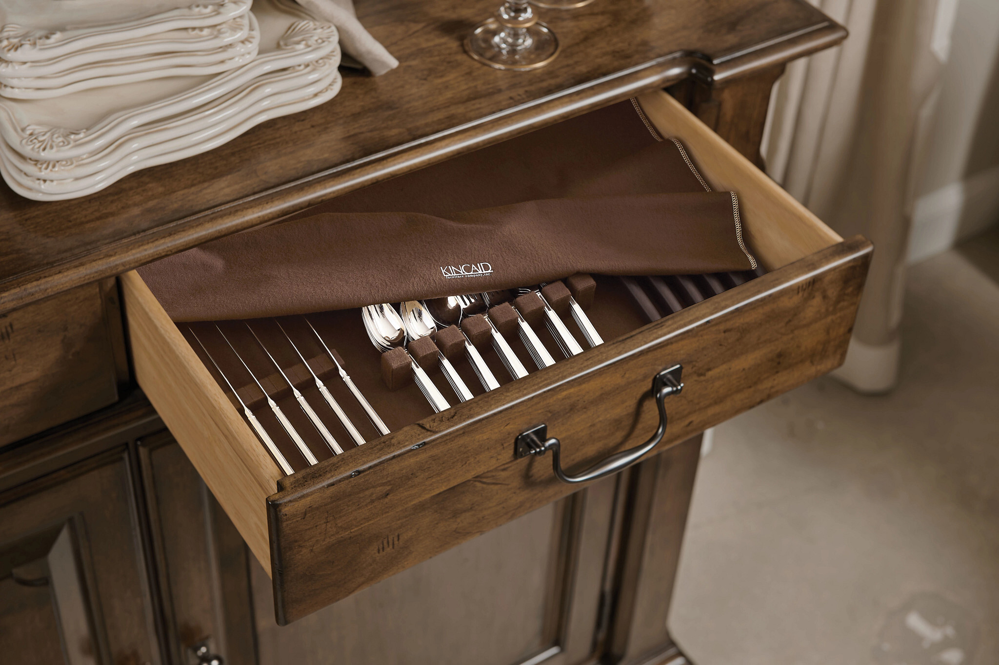 The Monte Buffet can be used with or without its matching hutch. Shown here on its own, the Monte includes two drawers and two large doors. Included in the top right drawer is a silverware tray, and behind the doors there are two, full-width adjustable shelves.