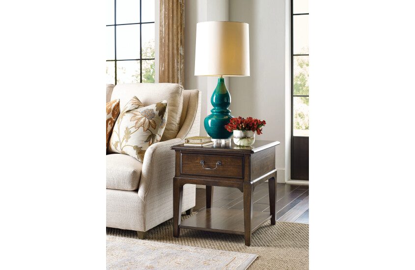 Traditional meets casual in Kincaid Furniture's Washburn End Table. This living room side table uses updated custom hardware to in a black nickel finish and clean tapered legs to set a fresh tone in what is otherwise a classic solid wood finish.