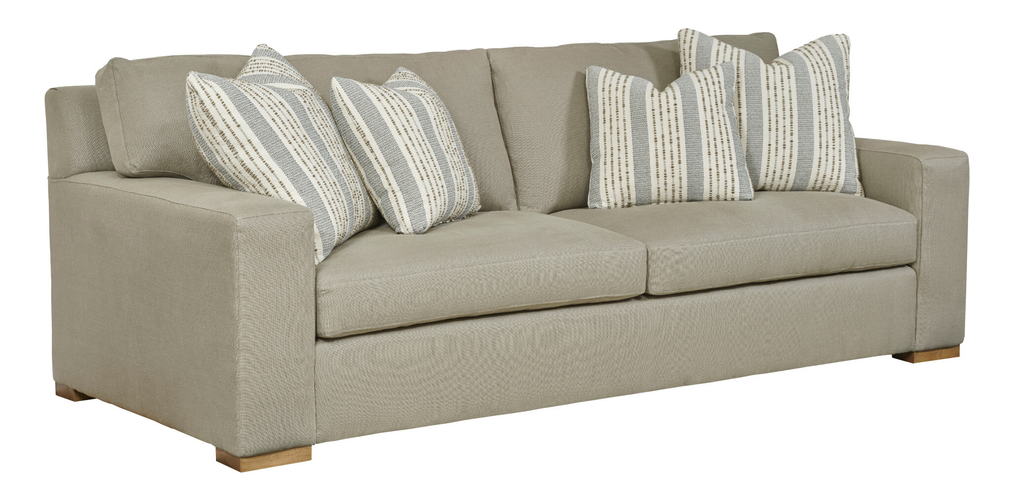 For the best in deep seating comfort and clean styling, may we suggest the Comfort Select Track Arm Sofa. Part of the Comfort Select design-your-own program, this 96 inch long sofa represents several of the best selling selections within the program. Measuring 42 inches in overall depth allows the inside seating depth to be a gracious 24 inches. This coupled with an 18 inch seat height creates a lounging experience that is both comfortable yet supportive. And because it is part of the design-your-own, it can be configured in lengths as long as 108" wide, as a sectional, or even with different style arms. To customize and drape fabric on this sofa, please visit the Comfort Select tool in the Build-Your-Own section. In the 96 inch version (shown here) the sofa comes as a two-over-two seat and back cushion configuration. The larger, 108" size uses a three-over-three cushion layout.