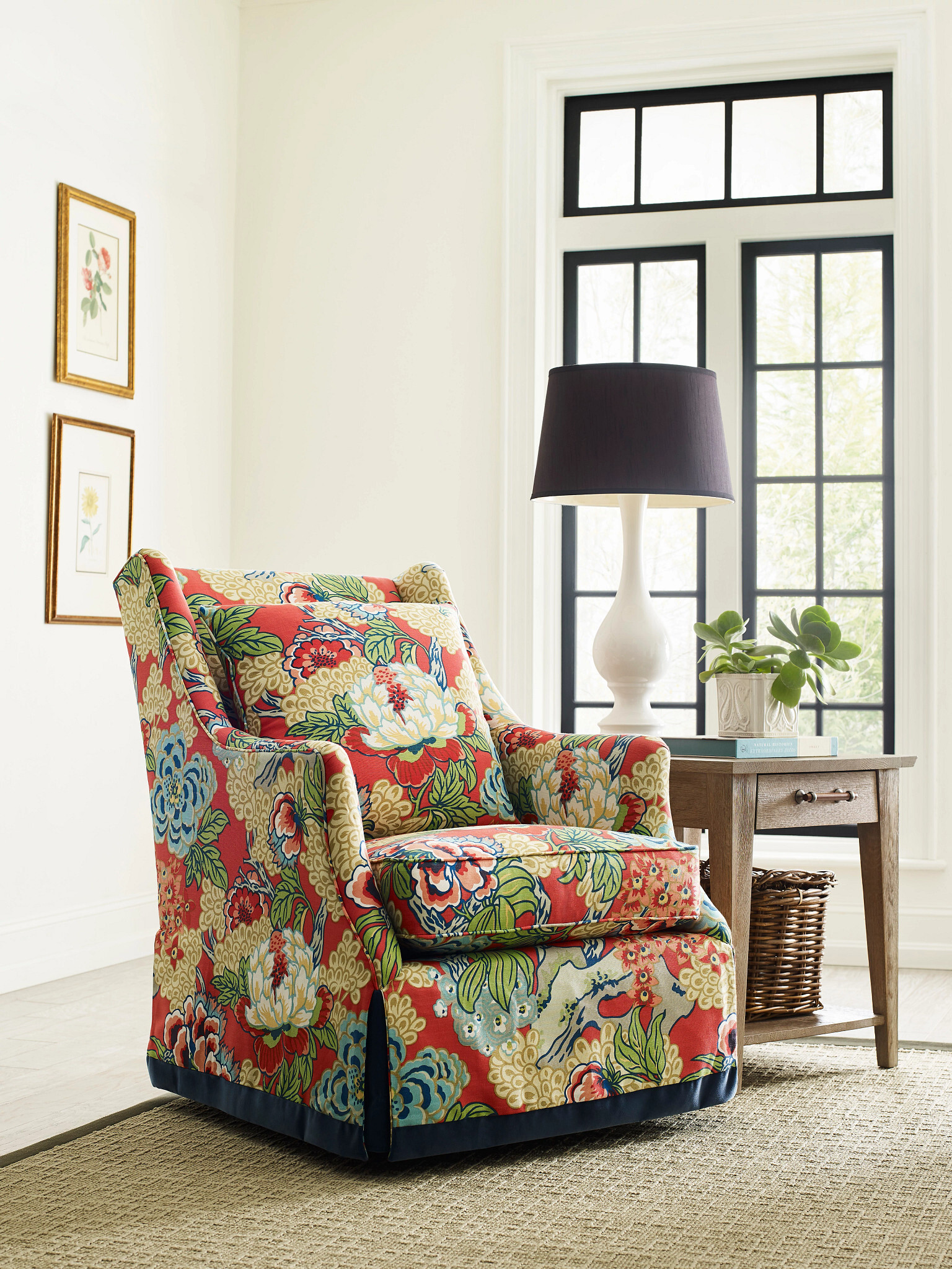 The Juliette features a clean look that works well in elegant spaces from decidedly traditional to casually transitional. It is designed with a flowing arm style that frames a loose pillow back and finishes with dress-maker skirt. Shown here as a swivel glider, the Juliette is also available as a stationary chair.