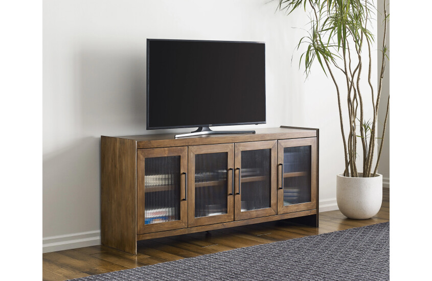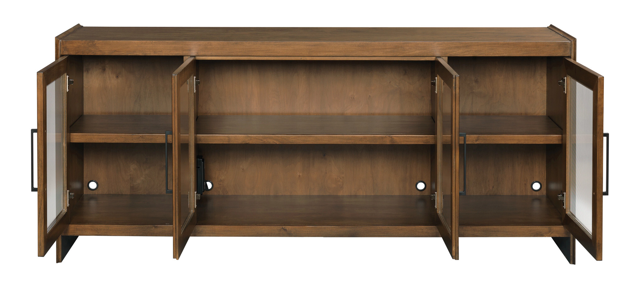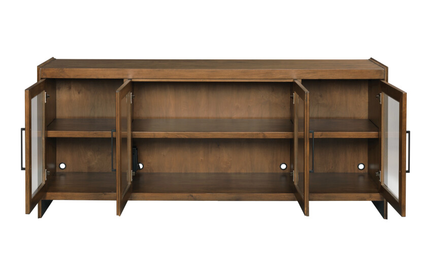 The Wagner Four Door Console is designed to function well in a variety of settings. Shown here as a large entertainment console, it can be used alone or flanked by one - or more - of the Wagner Cabinet for larger spaces. It uses framed, fluted glass on the door fronts to maintain a clean, transitional style. Behind the two middle doors is a single, large open space with one adjustable shelf. There is also an adjustable shelf behind each of the two end doors. And to assist with electronics, there is an electrical outlet integrated into the back of the piece.