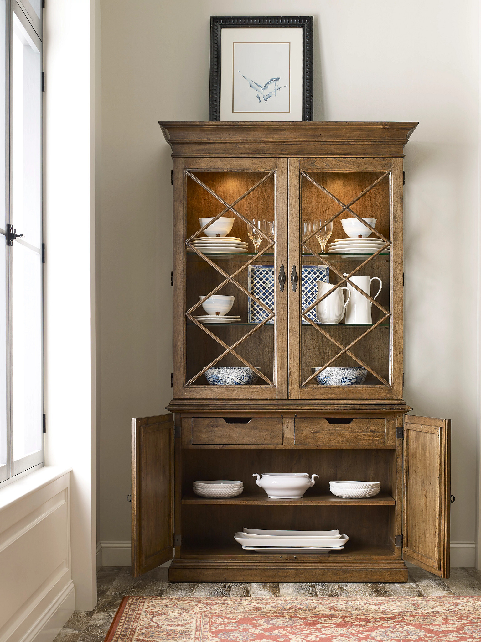 The Mortimer Cabinet is the just-right-sized vertical piece for today's open living and dining spaces giving the home the functional features of a china cabinet without requiring a large wall. The deck includes curio style tempered glass end panels on the deck portion, two adjustable tempered glass shelves, and recessed touch operated lighting. In the base there are two full depth drawers and one adjustable wood shelf. Built as a separate base and deck, the cabinet can be used as a base only as the base has a finished top.