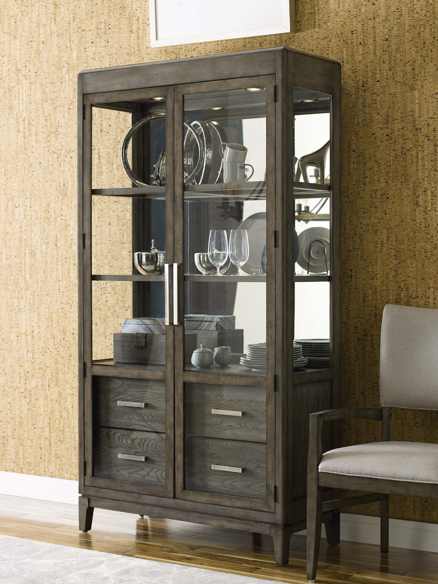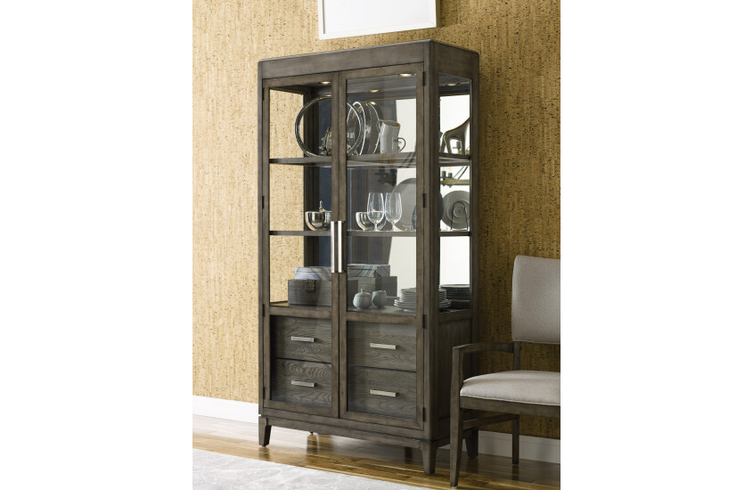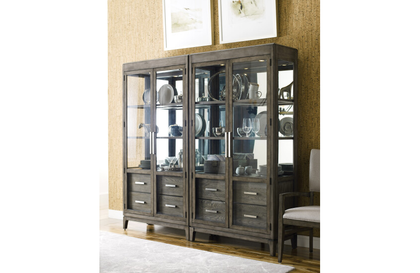 - Two drawers, two doors, two adjustable wood framed glass shelves with plate grooves, one fixed wood shelf, two can lights.