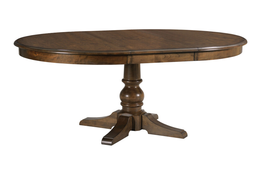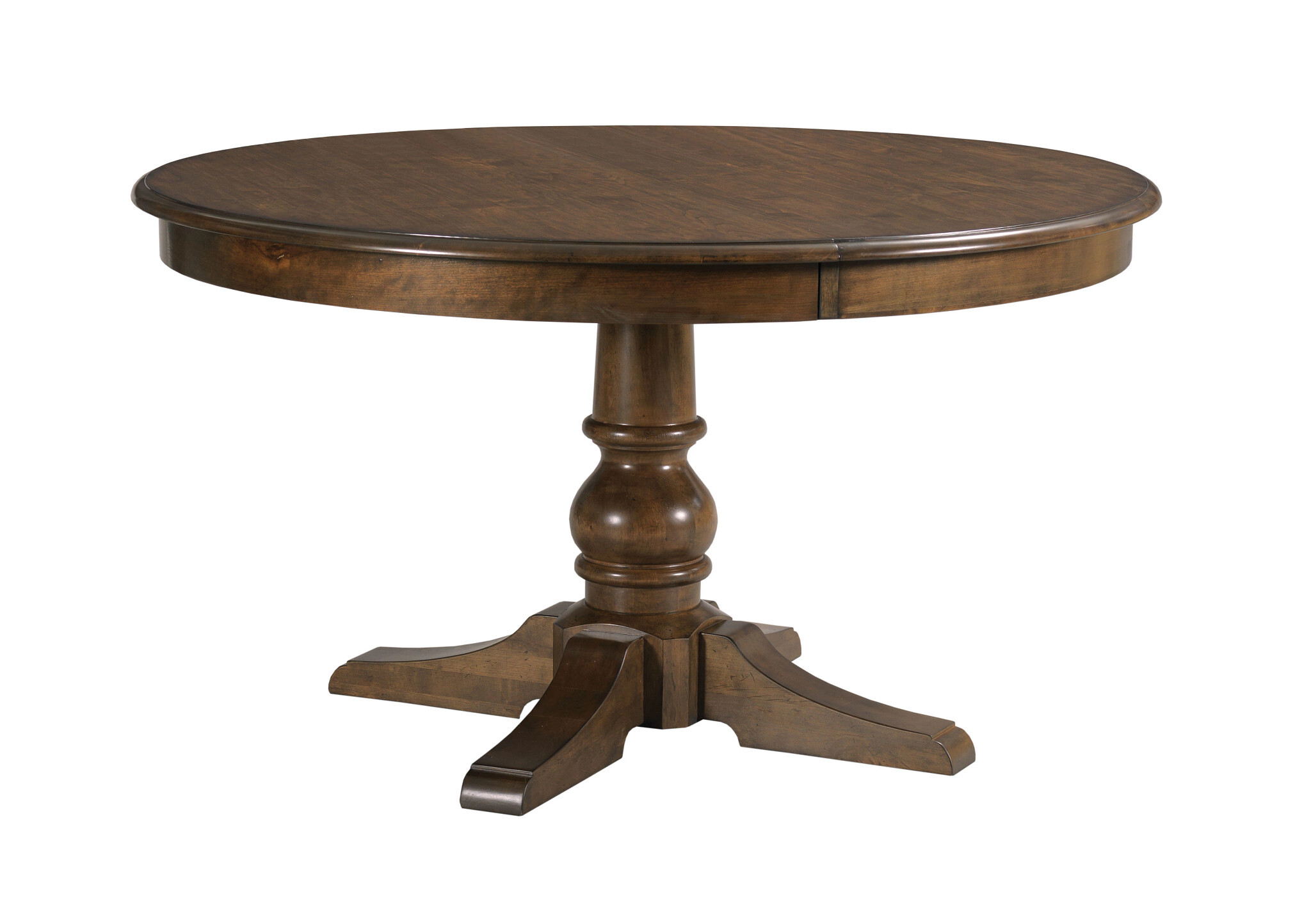 The Byron is a round, solid wood dining table with a pedestal base. With it's 54 inch diameter, this casual dining table is an option for open kitchen or breakfast nook dining spaces. Plus, it comes with a 20 inch leaf making it possible to comfortably seat six chairs. In addition to its timeless good looks, the Byron solid wood dining table features Kincaid Furniture's KinGuard Performance dining finish. The table includes one 20" leaf extending the table from 54" to 74".