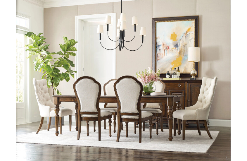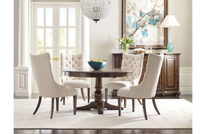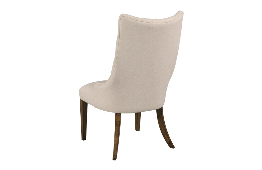 One of the best dining seats in the house, the Higgins Host Chair is designed to make the conversation carry on. Classic button tufted is modernized by the clean silhouette for a more casual vibe. It is also upholstered in a performance fabric to take a little bit of the stress out of dinner. The Higgins host chair has an upholstered seat and back. The seat height is: 19"; Seat Depth: 18.75".