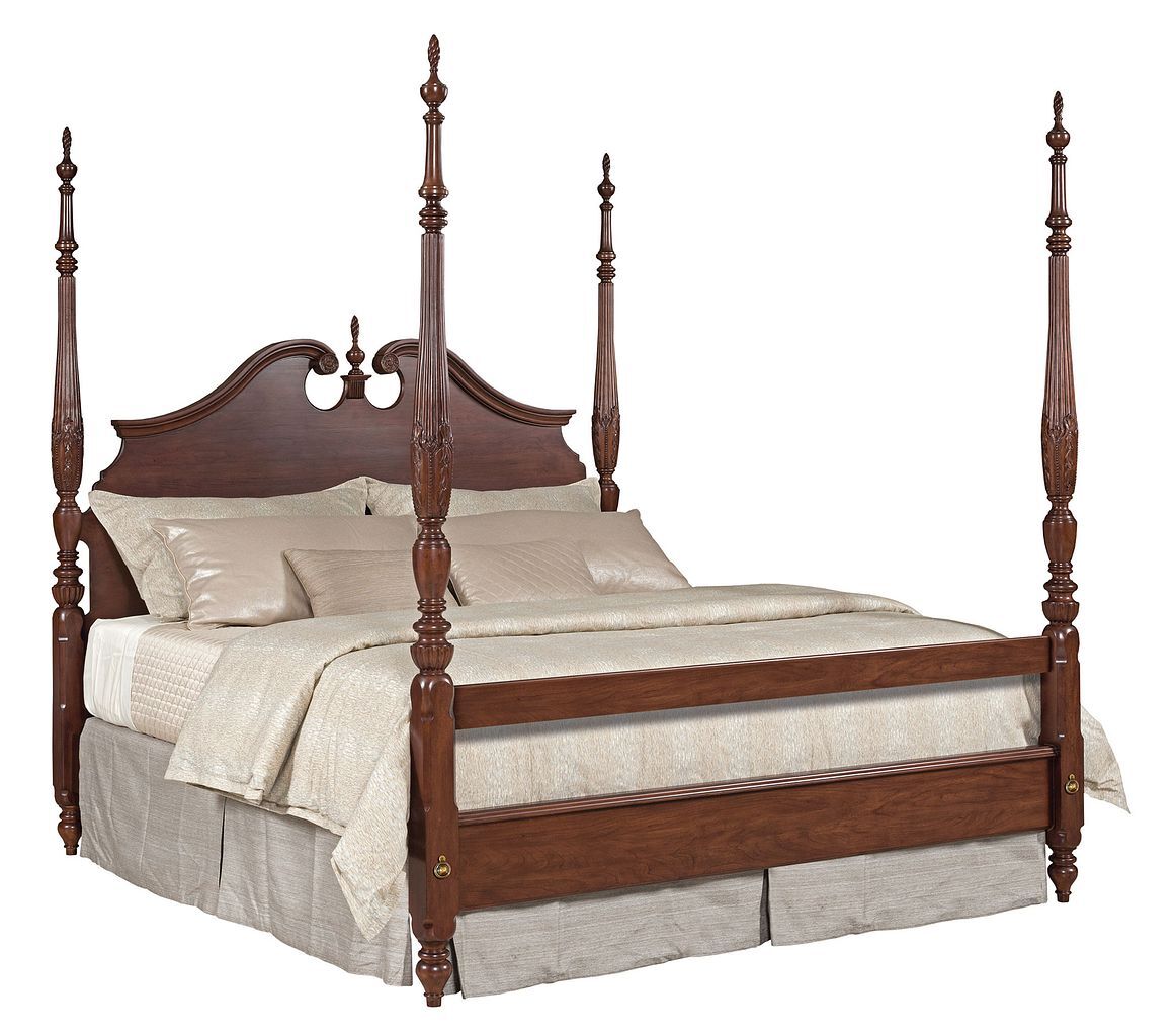 True 18th Century styling is found in the Hadleigh Rice Carved bed. From solid, hand-carved posts to the pediment styled headboard, this bed is a modern torch-bearer for classic furniture. It is available in Queen and King sizes. The package shown here includes a queen headboard, footboard, side rails & center support system.