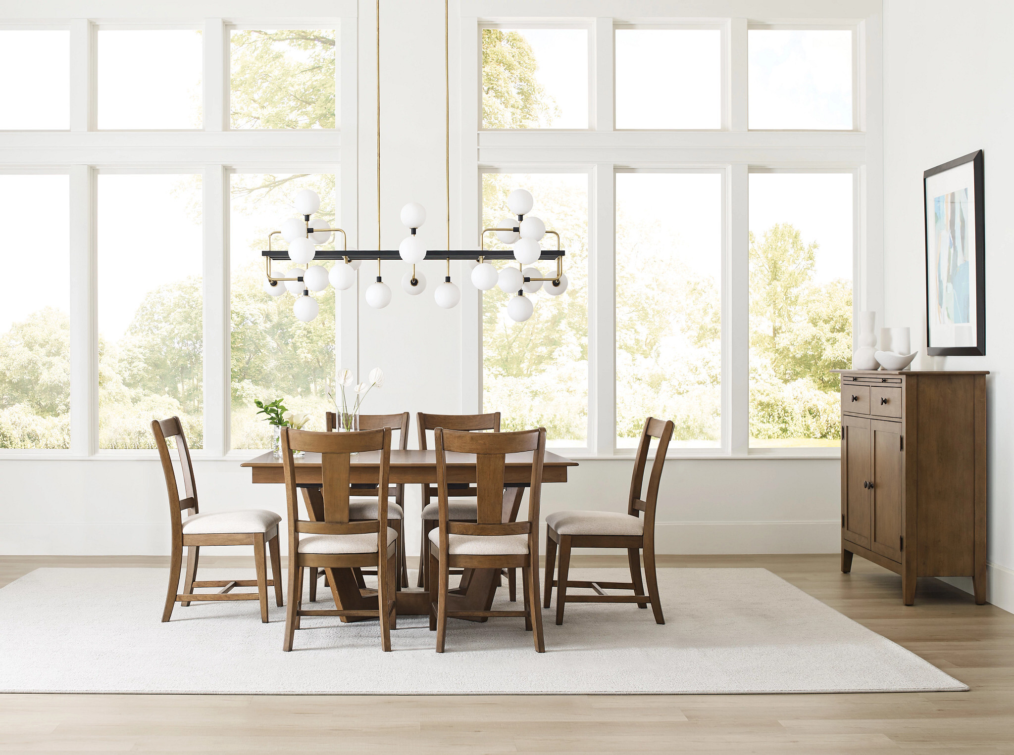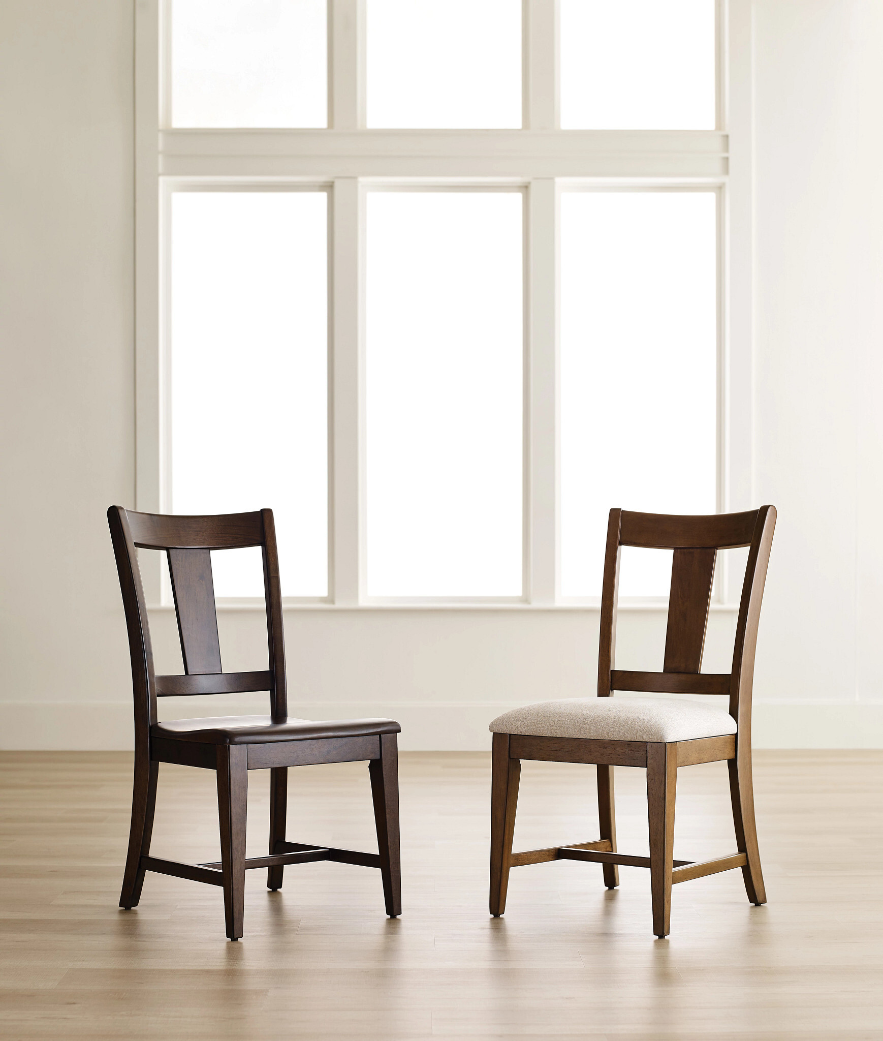 The more transitionally styled chair in the Kafe Casual Dining Collection is the Splat Back Dining Chair. With a somewhat minimalist design, the Splat Back chair features a clean, tapered splat in the silhouette of the back. Like the other chairs in the Kafe program, this one is also available in either the Latte finish (shown here) or the darker Mocha option. Adding to this choice is the option of using either an upholstered seat or wood seat (both are included at no extra charge). Many customers enjoy the comfort of a fabric dining seat so we used a performance fabric made to repeal stains and withstand years of everyday use. Others may prefer the wood seat option for its more casual look, and the quick cleaning and worry free nature of a solid wood seat.