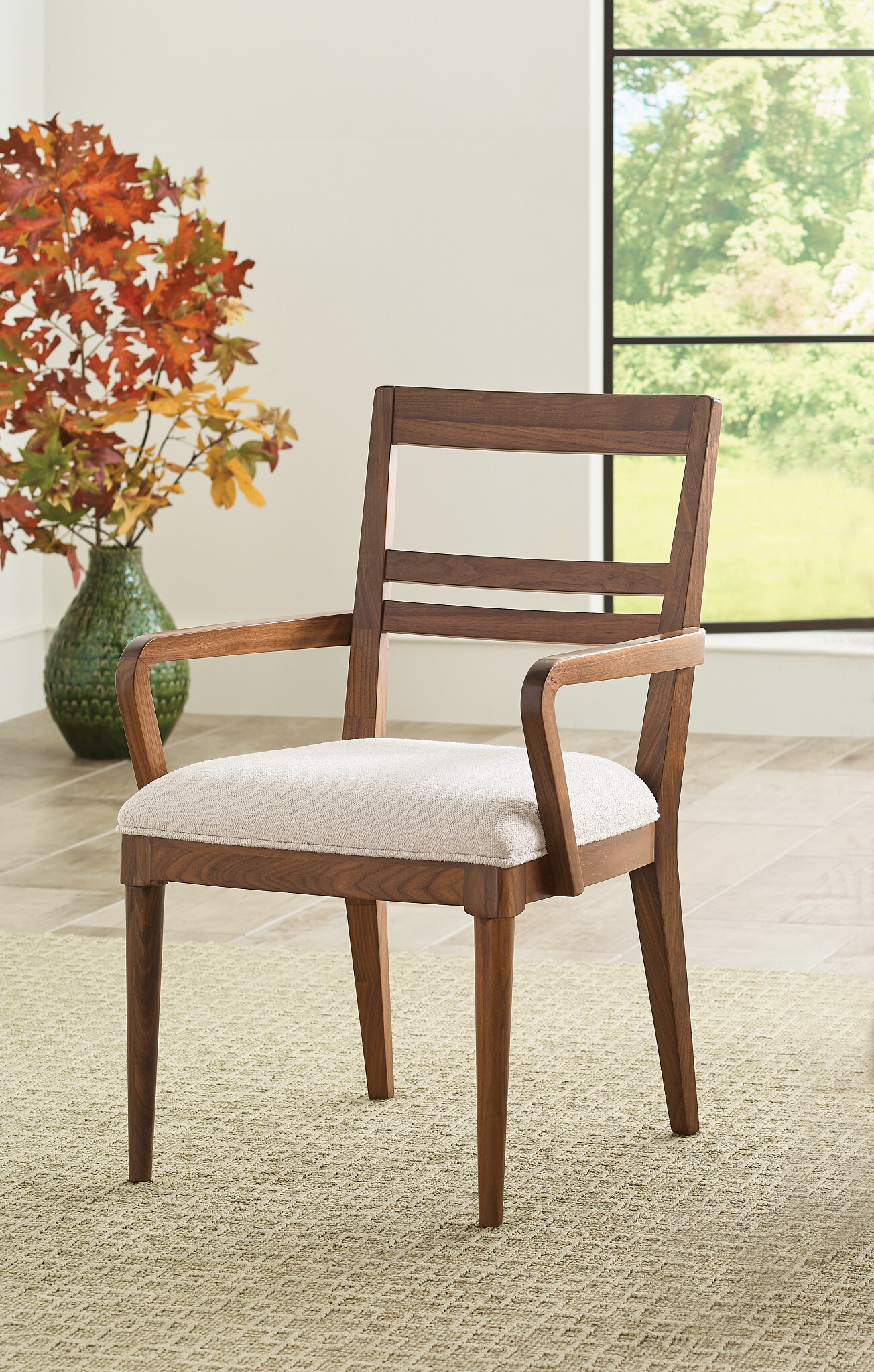 The Clubhouse Arm Chair exemplifies the merger of the Monogram Walnut collection's clean aesthetic and livable qualities. Designed with a balanced mix of angles and softly curved shapes, this dining chair works great in a range of spaces from modern to craftsman. Equally important in the design is the contrast of the natural Black Walnut wood tone with the light fabric upholstered seat. But rest assured, this isn't just any white fabric. The Clubhouse Chair features a textured fabric made with a boucle construction that includes a performance finish. This performance fabric allows for time to address basic cleaning in the case of spills.