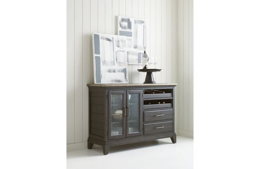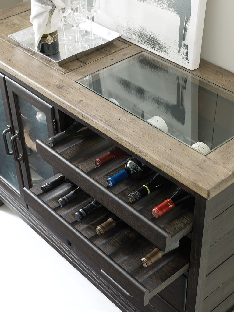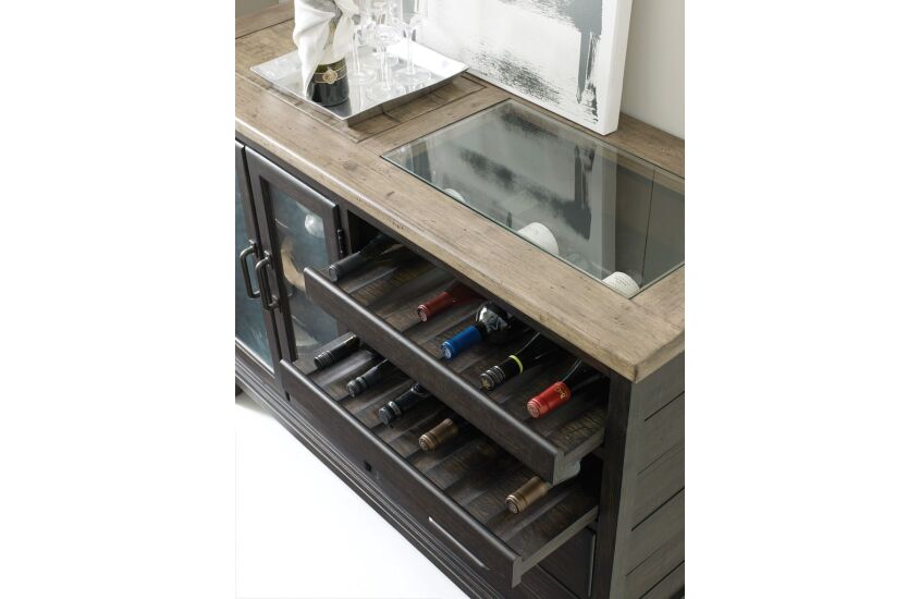 As the dining space continues to evolve, a broader range of suitable furniture options is being considered. Most of this progression has been driven by a move toward more casual interior design concepts and that is good news for our Pleasant Hill server. It features equal parts storage and display and is completely functional. Two wine bottle trays a visible under a clear glass top while seeded glass doors conceal two adjustable shelves. It also includes two full-depth drawers.