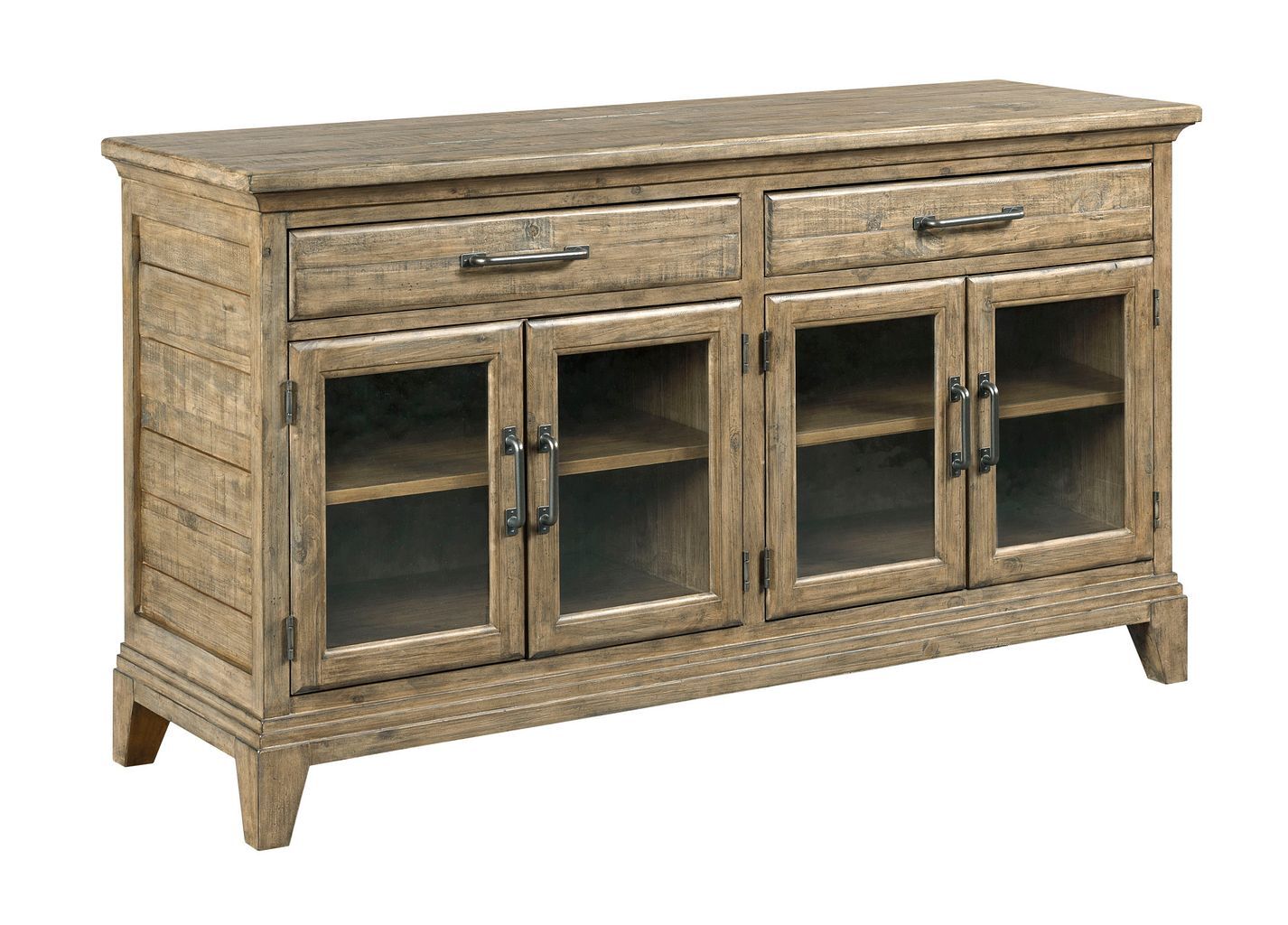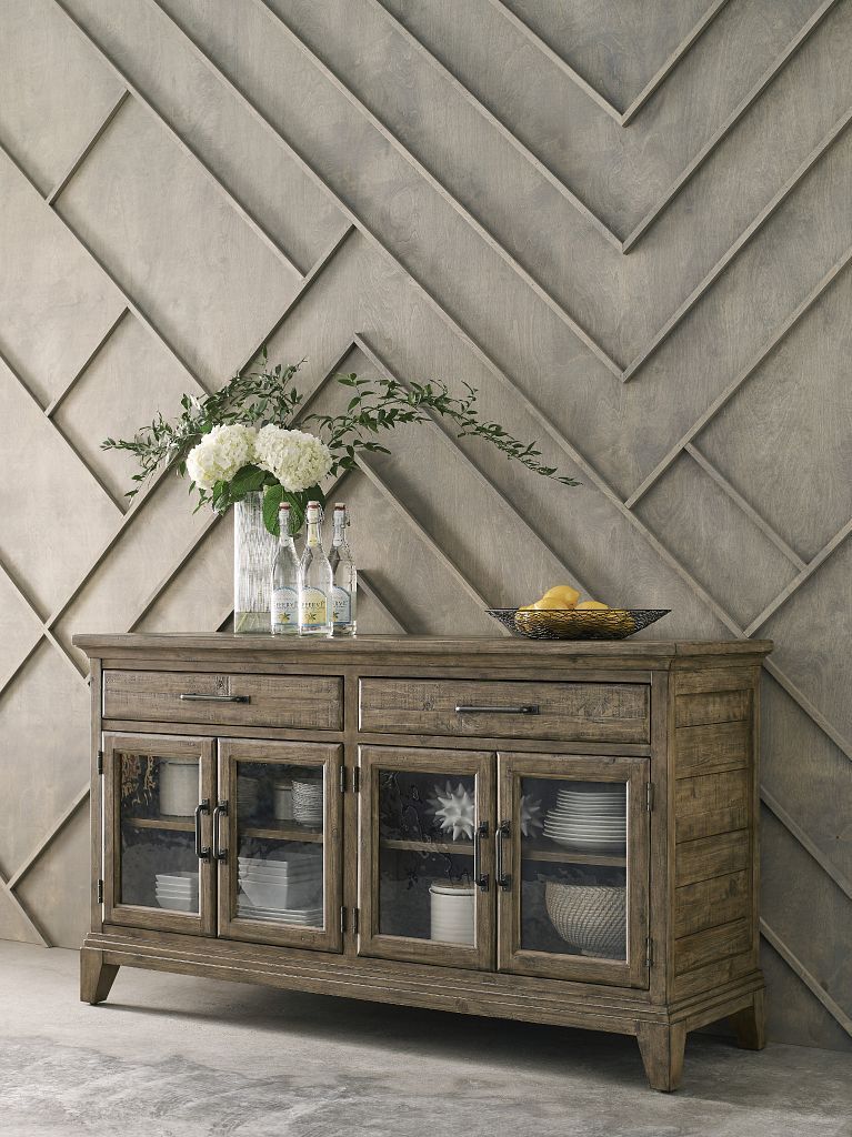 The Rockland Buffet uses all of the textural elements of Plank Road and blends them together. We particularly love how the seeded glass works with the uneven planking on the top and ends of the solid wood cabinet. There are also a few functional features that add to the piece such as adjustable shelves behind the doors, soft-close drawer glides, and a silverware tray fitted into the right drawer.