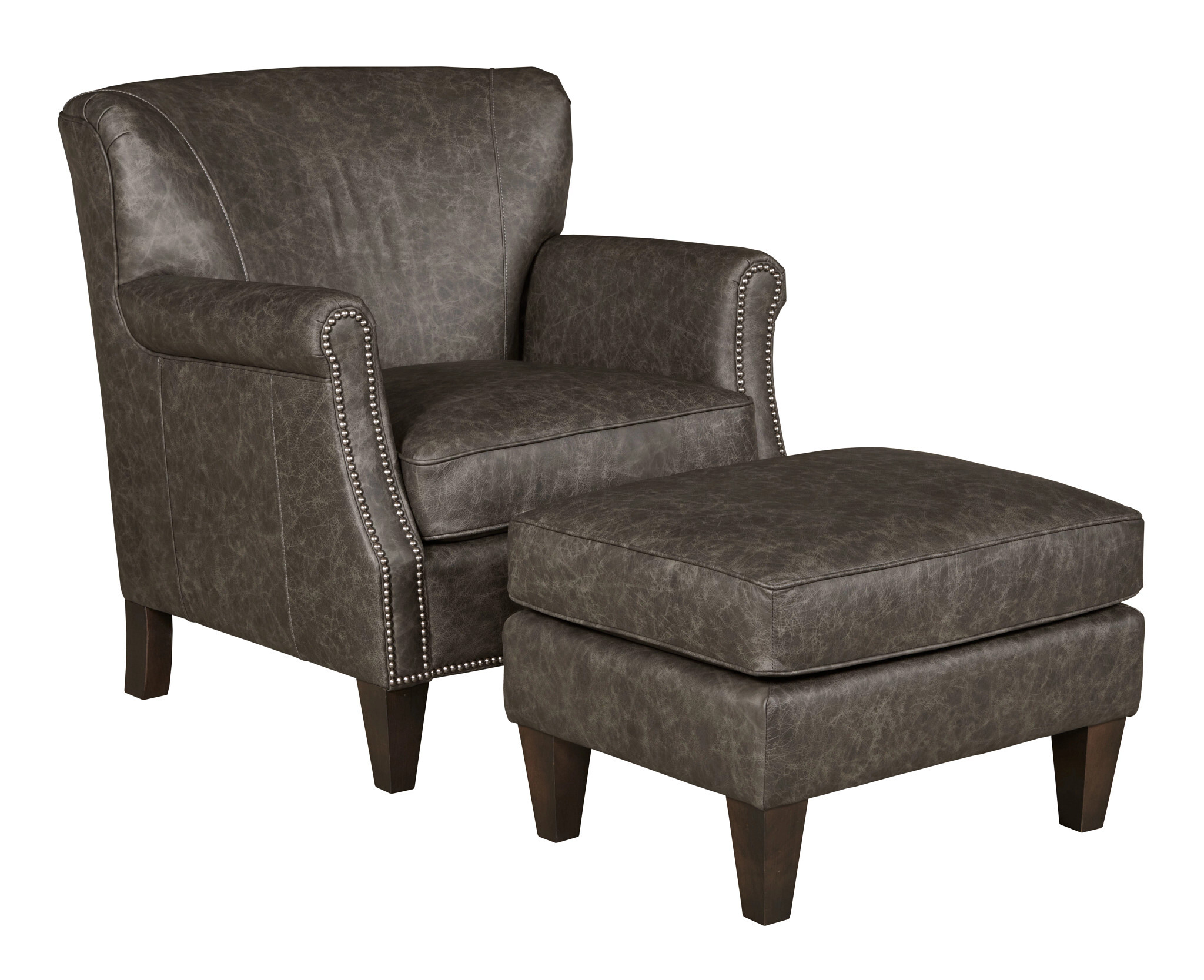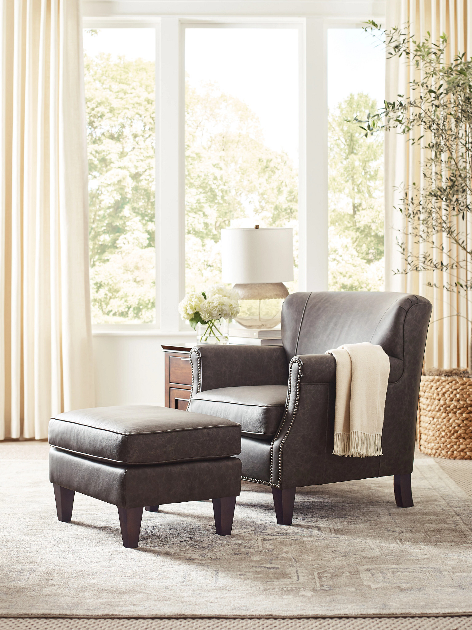 The Barrett chair and ottoman are shown here in leather and are also available in fabric.