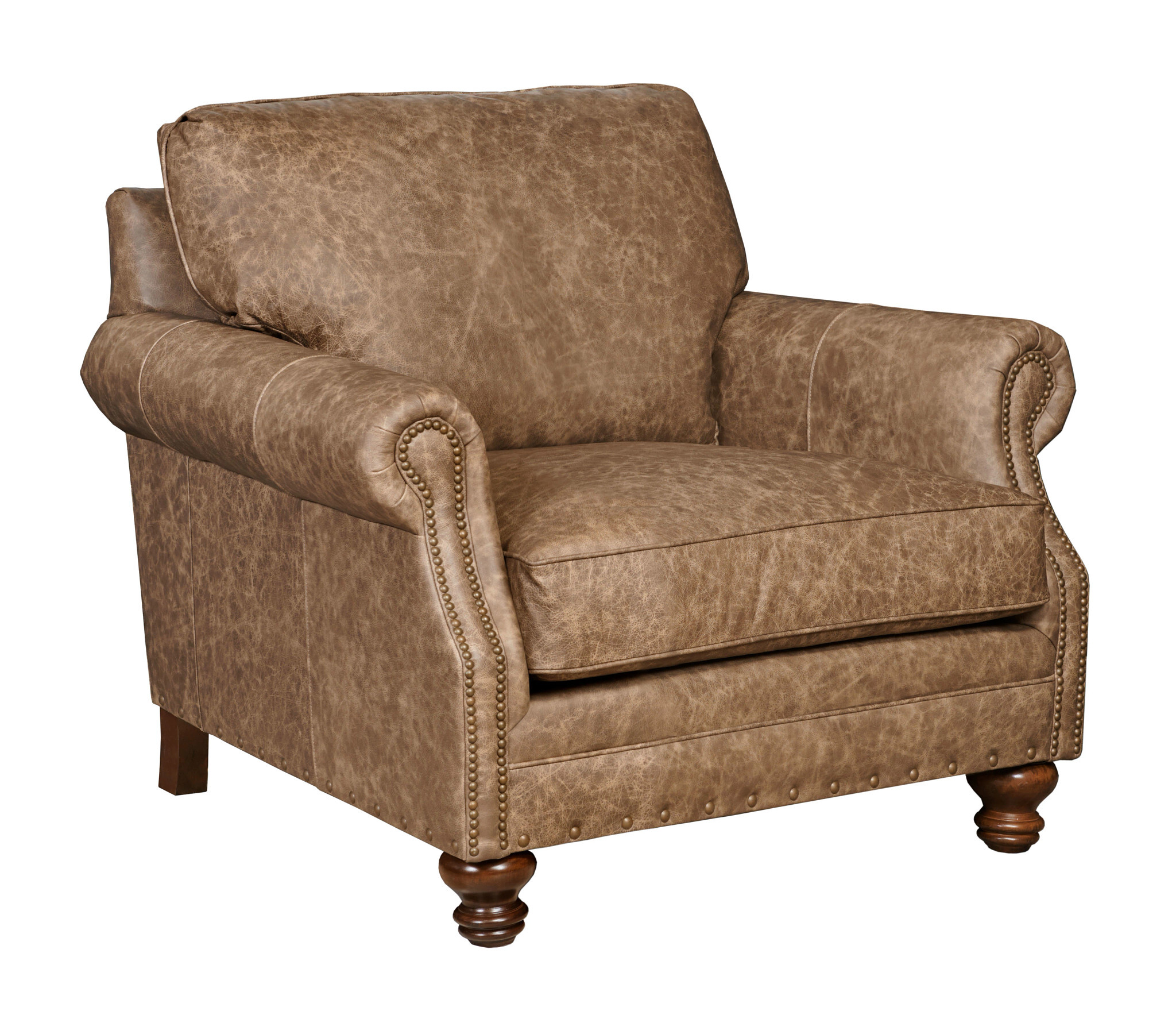When the space calls for comfort, classic styling, and plenty of seating, look no further than the leather Bayhill Collection. Shown here as a chair-and-a-half, the Bayhill is built to look and sit great for years to come. Stylistically, the Bayhill features a design built around a traditional rolled panel arm that adds a front scoop which is finished in nail head trim. The shaped lines of the arm flow downward to a turned, solid wood foot. The Bayhill can be ordered in any Kincaid leather or fabric, and is available in two sofa lengths along with matching loveseat, and ottoman.