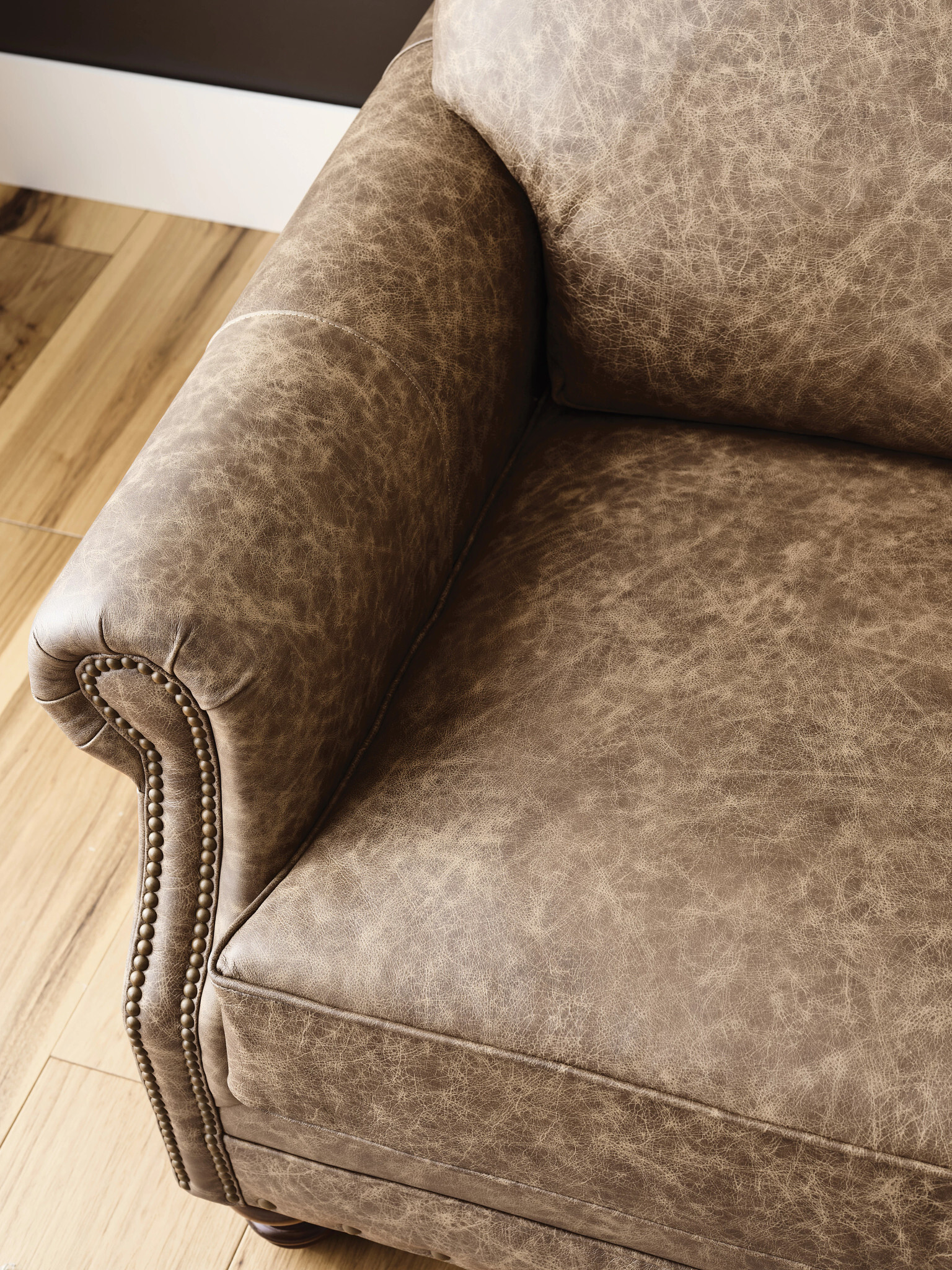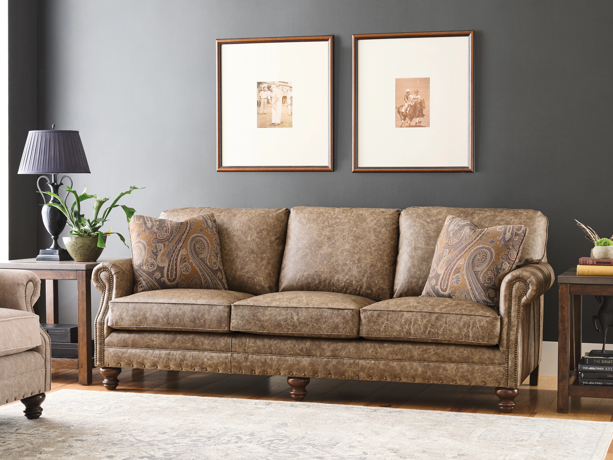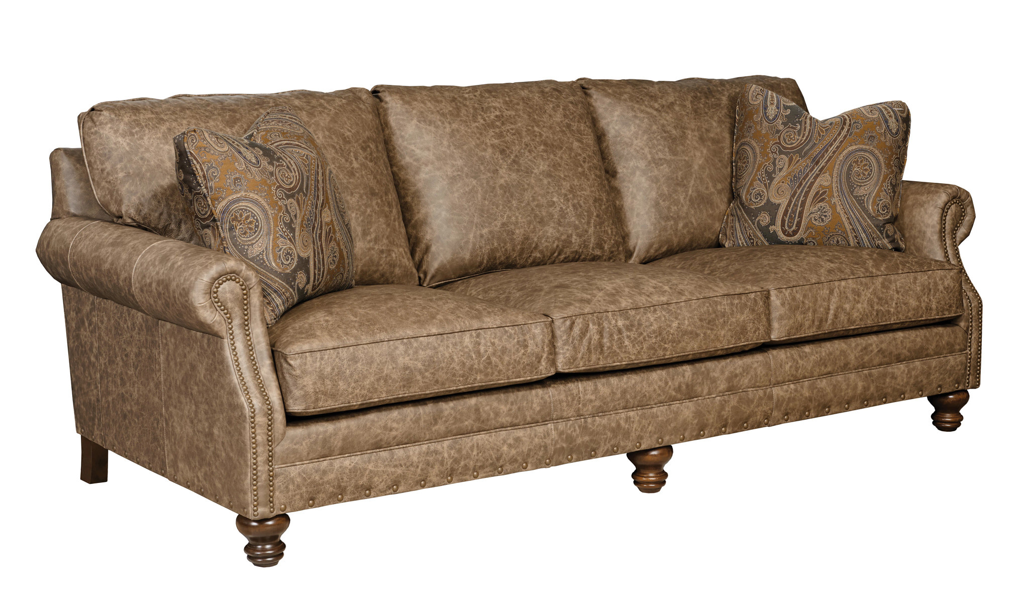 When the space calls for comfort, classic styling, and plenty of seating, look no further than the leather Bayhill Sofa. Shown here in the larger length, the Bayhill is built to look and sit great for years to come. Stylistically, the Bayhill Leather Sofa features a design built around a traditional rolled panel arm that adds a front scoop which is finished in nail head trim. The shaped lines of the arm flow downward to a turned, solid wood foot. The Bayhill can be ordered in any Kincaid leather or fabric, and is available in two lengths along with matching loveseat, chair, and ottoman.