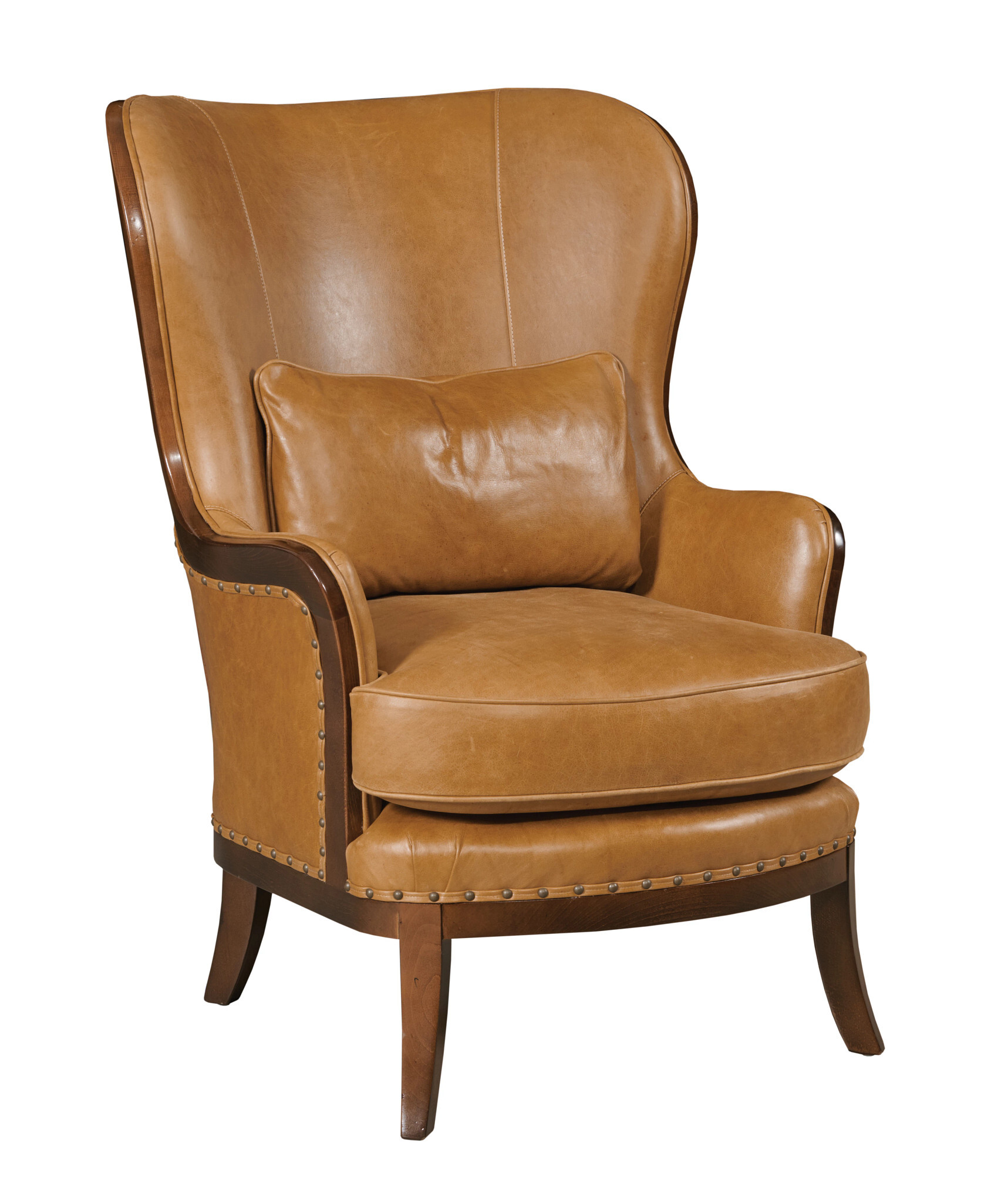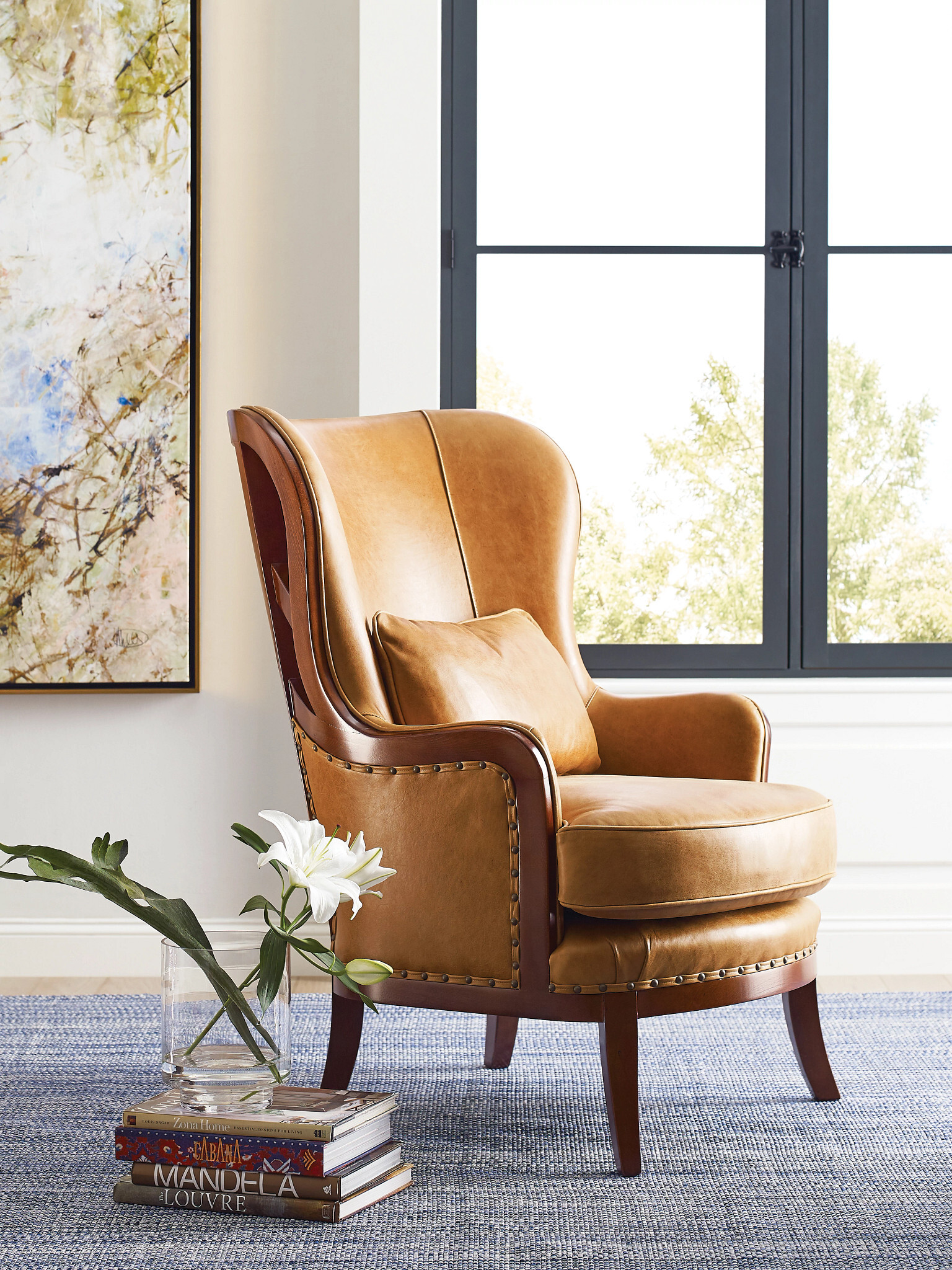 The Collier Chair is a beautiful balance of character and comfort. It leverages its curved, exposed wood frame to not only give shape but to also create contrast with the upholstered areas. It is available in both fabric and leather (shown here). Both the nailhead trim and the wood finish can be specified in a choice of options.