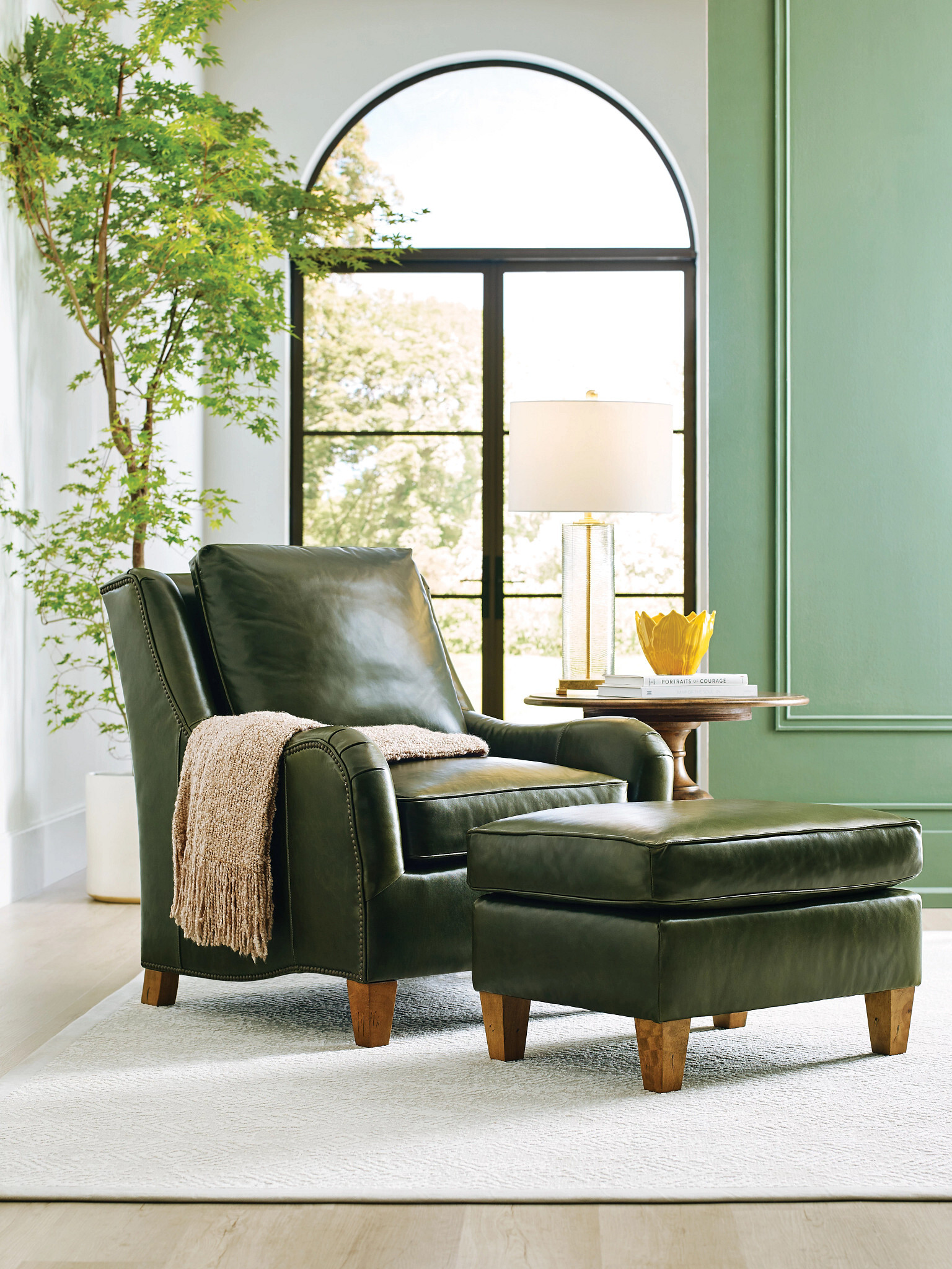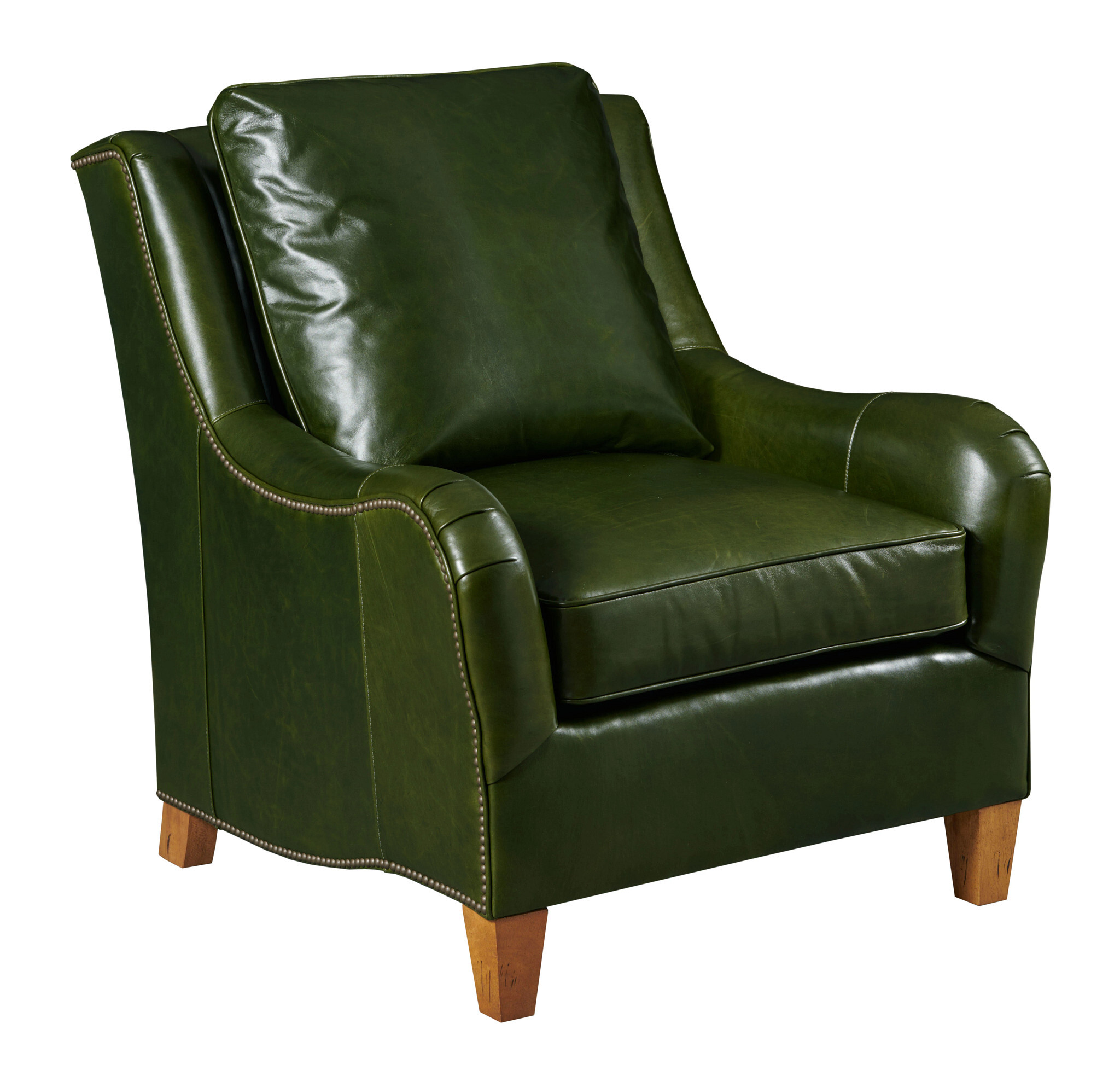 The Emerson leather accent chair has a way of meshing with nearly any decor. Shown here in a beautiful top grain, aniline dyed olive tone, it successfully fits in with the hottest trends while standing out as center piece of the room. The arm of the Emerson features is framed with nailheads - which can be specified in five colors - that follow the lines of the arm from the base to the top rail of the back.