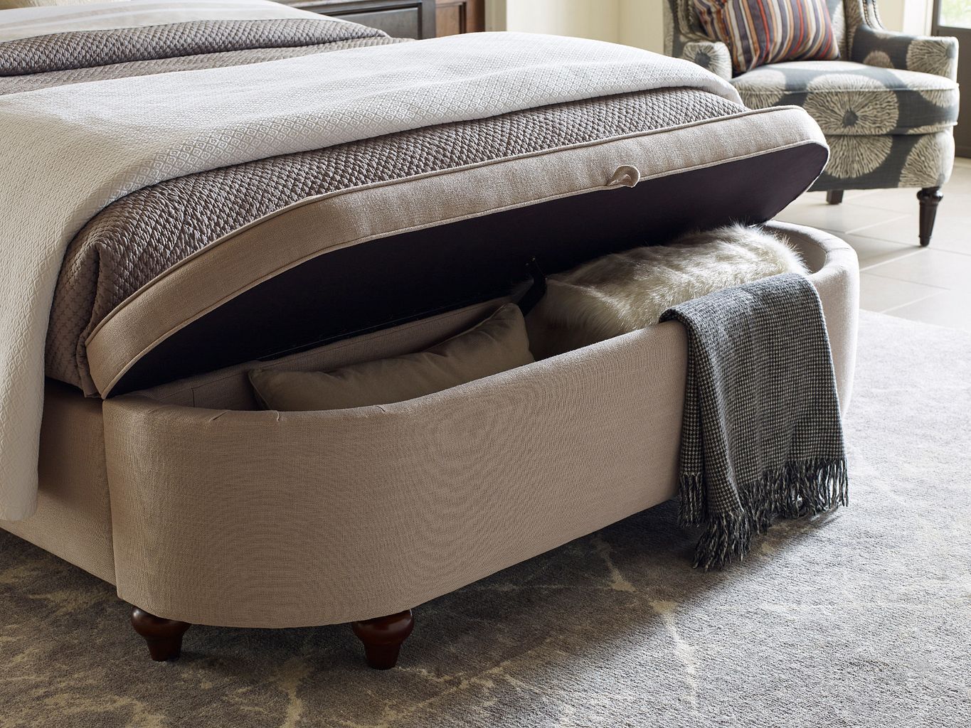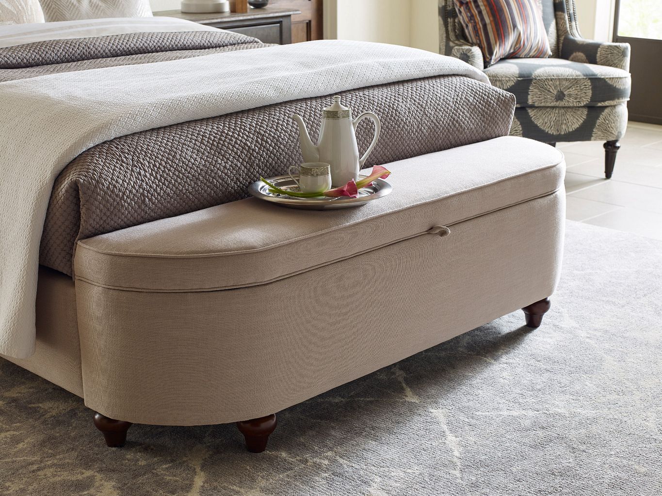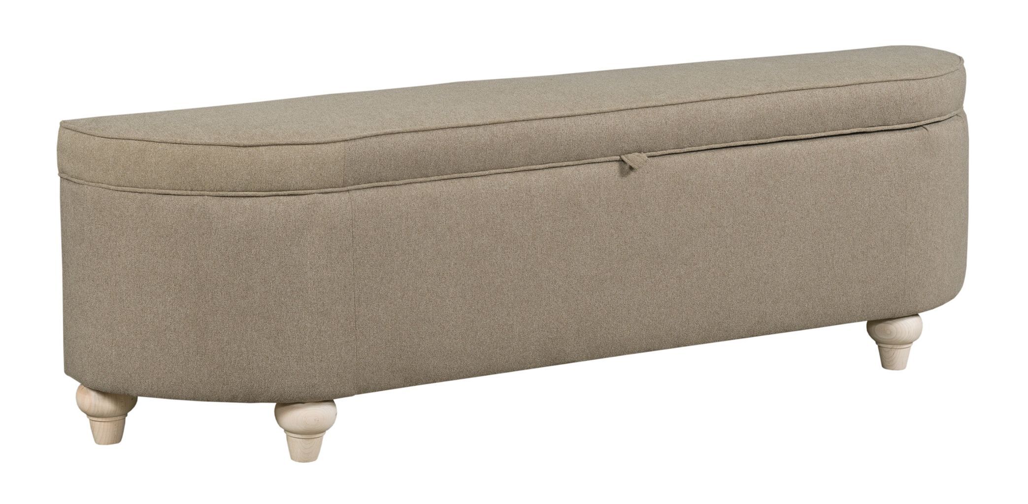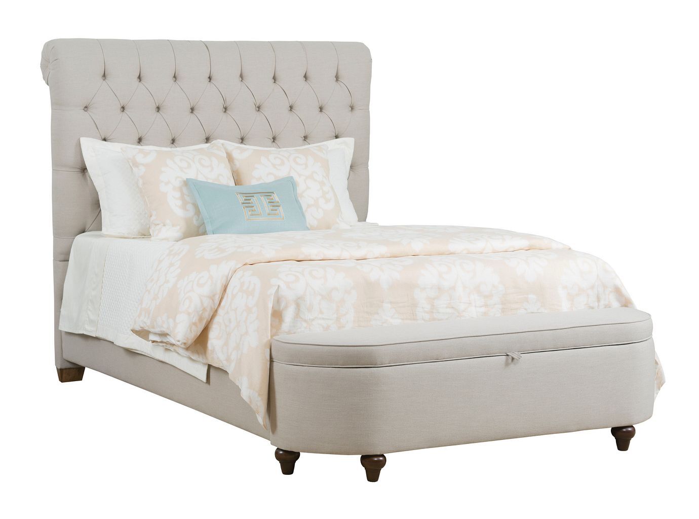 A functional option to complete a Kincaid upholstered headboard is our upholstered storage footboard. It could just as easily be called a "bench footboard" since it is the perfect height to have a seat on! And just like the headboards and matching footboards, it can be ordered in any of our custom order fabrics or in the customer's own material. The storage space is also upholstered and features a hinged design for easy lift top access. It is also available in California King and Queen sizes and each upholstered footboard includes the matching side rails that will connect it to a Kincaid upholstered headboard.
