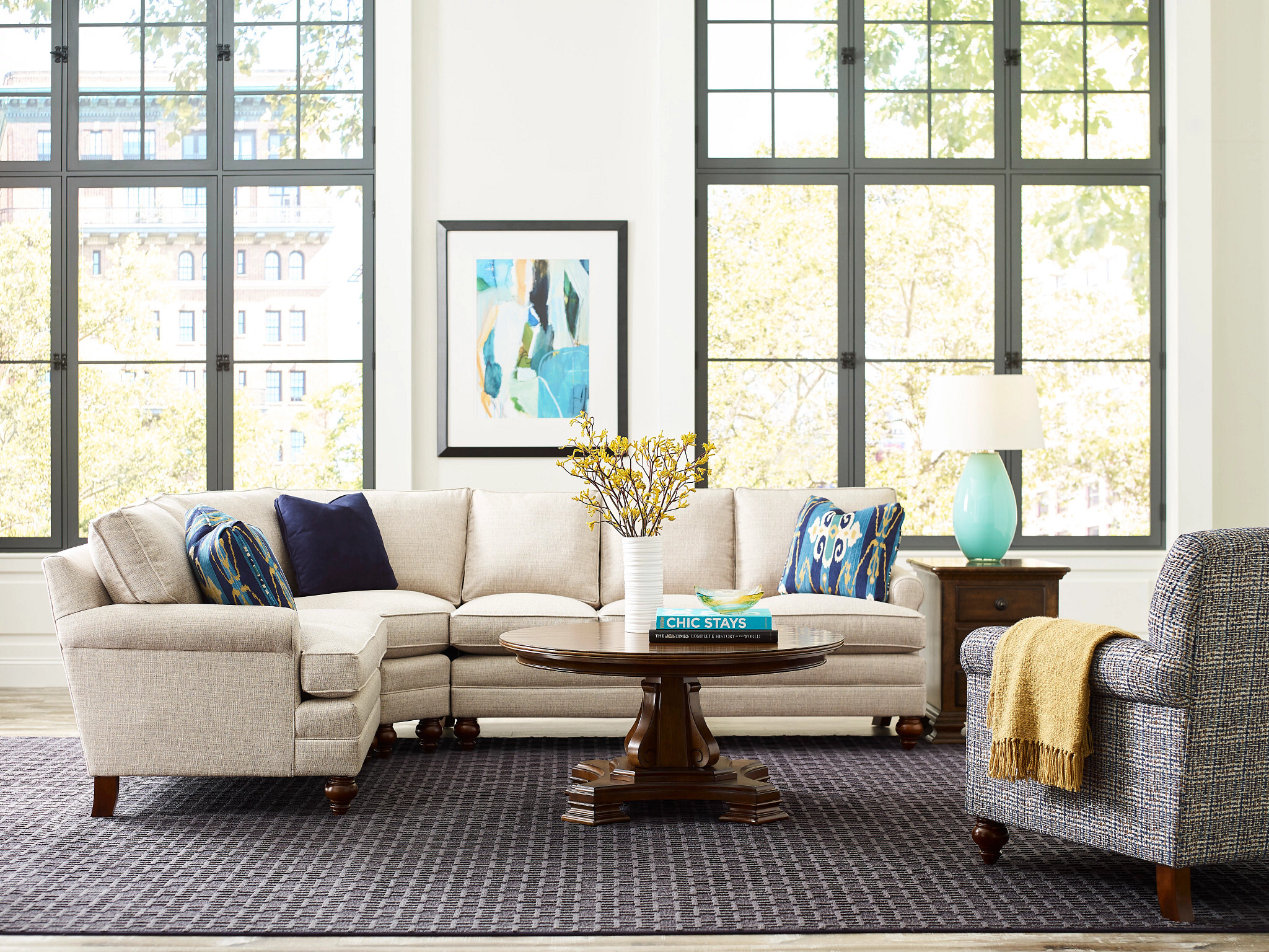 For a smaller scale that stays big on comfort, the Studio Select program is an excellent choice. Studio Select custom sofas and sectionals feature a 36 inch overall depth and offer arms that are proportionately scaled making it an ideal seating option for rooms where oversized arms seem clunky and misplaced. To make it your own, this program offers five arm styles, each of which can be specified in either T-cushion or Flat Front (where the arm comes flush to the front of the piece). Here it is shown as a sectional with a Standard Sock arm with T-cushion. Another style option is the base. This particular configuration uses the Turned Leg option. Other options include the clean lined Tapered Leg, or the more traditional Skirted Base. Finally, you can choose from an option of layouts, sizes, and other details ranging from the loose pillow back (shown here) to semi-attached or even a tight back (no back cushions). And there are finer points that can be selected also like: nail head trim, welts or top-stitch seams, cushion styles, and more.