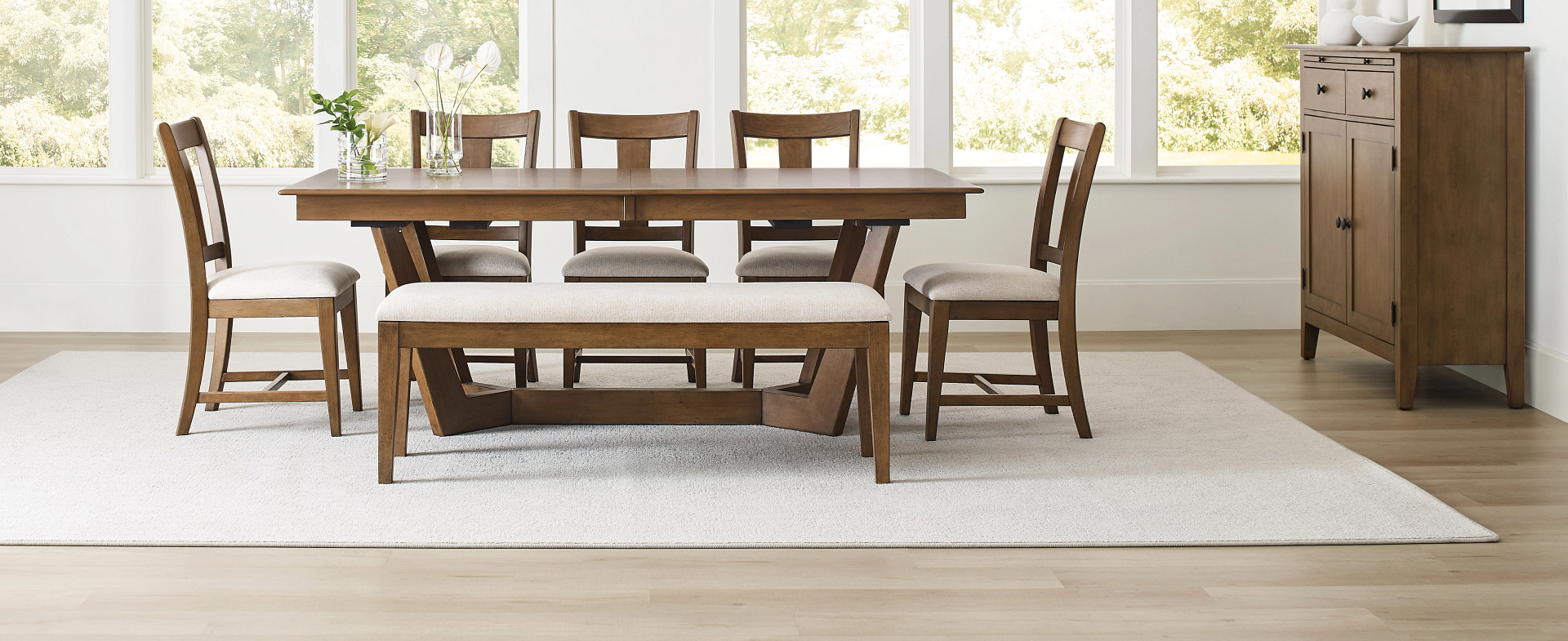 - Solid wood dining tables from 40” round dining up to 80” rectangular dining (which extends to 100" with included leaf)